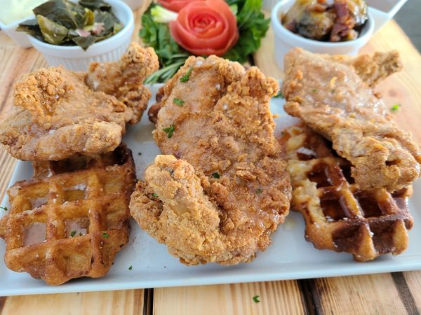 Belgium Waffles, Kernel Fried Chicken Tenders, Sawmill Gravy, Pickle Chips, Butter, Siracha, Syrup